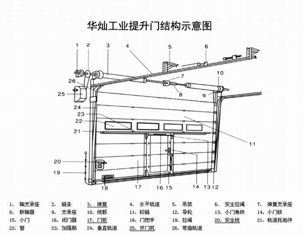 6.防墜落裝置、 安全氣囊(可選),防止門體下墜或門底部與障礙物相碰時,門則自動停止或反向運行,免事故發生;防鋼絲繩斷裂裝置、扭簧斷裂安全裝置。防止任何方式的門體傷害人、物的可能。