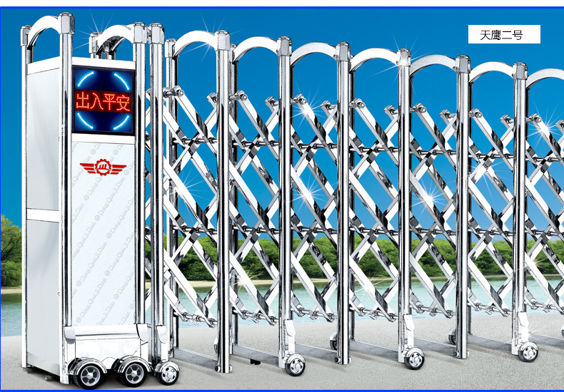 1、伸縮門體:伸縮門體是由門體大框、交叉撐、軸(定軸、滑軸)及門體輪等主要部件組成。門體整體為金屬結(jié)構(gòu),按材質(zhì)又分為不銹鋼門體、鋁合金門體、壓鑄鋁門體。