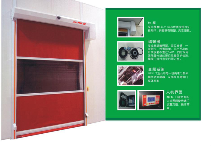 軟質快速卷門又稱為快速門、快速卷門、高速門、高速卷門,是通過PLC、變頻器、編碼器控制(PVC材質)門簾快速升降,并準確定位的一種工業門,多用于食品、電子、印刷等對環境要求較高的場所,主要作用是起快速隔離的作用從而保證車間空氣質量無塵等級。 快速軟簾卷門是指每秒運行速度超過0.6米的門,是快速升降的無障礙隔離門,主要功能是保溫、保濕、防塵、防蟲、隔音等,使車間保持恒溫、恒濕、潔凈、防止空氣對流的工作環境。適用于食品、醫藥、電子、橡膠、化工、汽車、紡織、物流等領域。